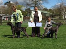 W.E.L.K.S. CH SHOW - A day of April showers for the first outdoor champ show of the year but at least it was outside even though when the sun went in it was a tad chilly! Logan hadn't been to a show since January as he couldn't go to Crufts and then his breeder judged at the GSPA Ch show in March, so it was with great delight that he picked up his 3rd CC of the year in as many shows. Our judge was Mrs Julia Thomas (Knabynnus GSP's) who had a great entry including 23 in Post Grad bitch, where Greta was awarded VHC. Greta thought that today instead of leaping in the air when doing her triangle, she would have a bark, the little madam that she is!