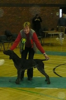 DRIFFIELD CH SHOW - Back to the normal weather of rain, rain and more rain! Our judge today was Mrs Barbara Rigby and today Greta did better than Logan in the breed classes, and she even managed to keep all 4 feet on the ground today! She was 2nd in Junior to the Res CC winner and Logan scraped in with a VHC in Limit. Lily wasn't entered today. However, Logan then went under Dr Ron James in the Special Yearling Dog stakes and won the class and best special yearling overall, despite Catherine falling over in the ring!! We were in the money again as it was £75 for 1st place. We've heard that the drinks are on us at the next show! .........