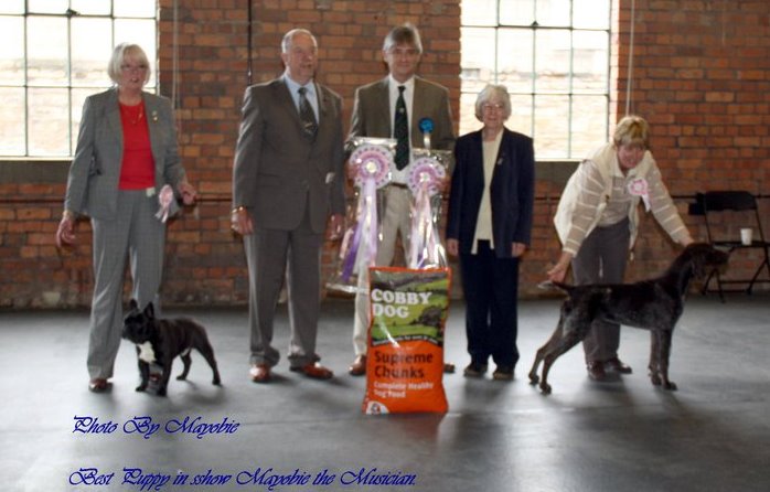 GOYT VALLEY GUNDOG SOCIETY OPEN SHOW - December 31st. Logan sees 2011 out with a bang! He was in his first Junior class and went B.O.B, followed by Best in Show! The breed judge was Mrs Hazel Moulding (Billsborough Pointers) and the BIS judge was Mr Geoff Hargreaves (Ghyllbeck). It was a lovely day for our breed as his half brother (Winterwell Jelly Belly at Nyliram) by Sh Ch/Am Ch VJK-Myst Sterling of Barleyarch, was Puppy Group 4.
