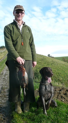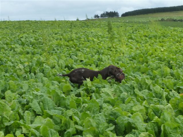 On the first day of the pheasant shooting season, Logan goes on his first 'shot over' day at Presteigne, which is on the mid Wales/Shropshire border. Amazingly, it only rained a little at the start of the day and we were then treated to a great day in beautiful countryside with plentiful birds, an accommodating keeper and excellent ground for our HPR's. Our young Logan hunted and pointed well and competantly carried out his first retrieve on warm game and can't wait for his next outing! Pictured below is Logan in the beet retrieving his first pheasant of the season.