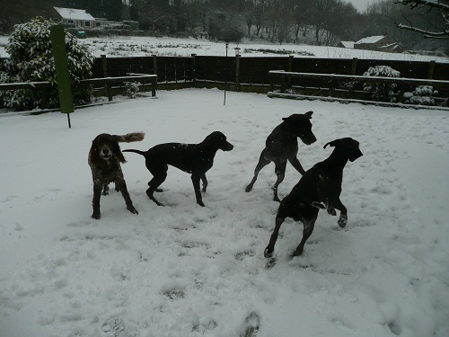 The first real snow of the year arrives in Lancashire and the dogs take advantage of it. Allan goes beating and pictured below are the beaters setting off and the dogs playing in the garden, minus Kenco who chose to stay in front of the fire!