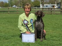 W.E.L.K.S. CH SHOW - A day of April showers for the first outdoor champ show of the year but at least it was outside even though when the sun went in it was a tad chilly! Logan hadn't been to a show since January as he couldn't go to Crufts and then his breeder judged at the GSPA Ch show in March, so it was with great delight that he picked up his 3rd CC of the year in as many shows. Our judge was Mrs Julia Thomas (Knabynnus GSP's) who had a great entry including 23 in Post Grad bitch, where Greta was awarded VHC. Greta thought that today instead of leaping in the air when doing her triangle, she would have a bark, the little madam that she is!